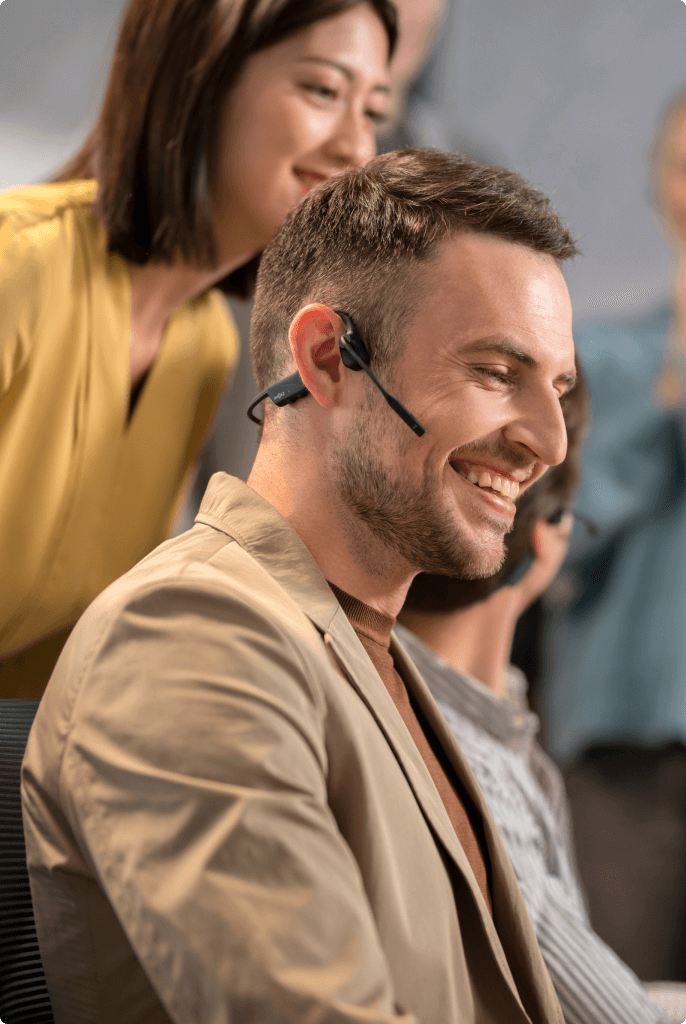 Bleiben Sie mit OpenComm2 unterwegs verbunden. Genießen Sie glasklare Anrufe, stabile Verbindungen und uneingeschränkte Mobilität, während Sie dank unseres charakteristischen Open-Ear-Designs Ihre Umgebung im Auge behalten.